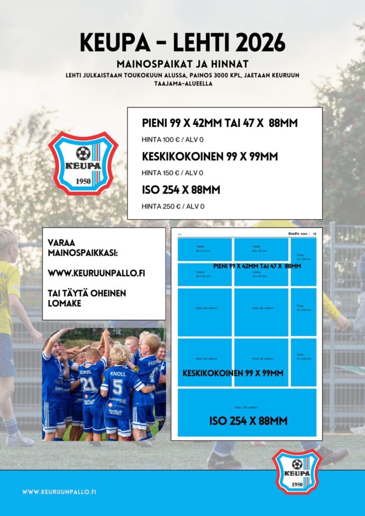 Ostamalla mainospaikan KeuPa-lehdestä tuet suoraan Keuruun Pallon toimintaa ja paikallisen jalkapallon kehittämistä. Lehti tavoittaa laajasti seuran pelaajat, perheet, yhteistyökumppanit sekä muut jalkapallon ystävät.